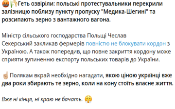 Міністр сільського господарства Польщі Чеслав Секерський закликав селян повністю не блокувати кордон з Україною. А також попередив, що повне закриття кордону може призвести до припинення експорту польських товарів до України.
