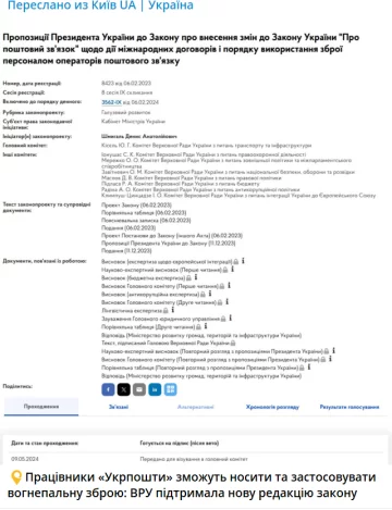 Працівники «Укрпошти» зможуть носити та застосовувати вогнепальну зброю. ВРУ підтримала нову редакцію закону. Про це повідомляють в соціальній мережі, з опублікованим фото закону про нововведення.