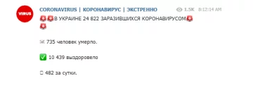 Как сообщает Телеграм-канал CORONAVIRUS | КОРОНАВИРУС | ЭКСТРЕННО, на 3 июня в Украине 24 822 официально подтвержденных случаев заражения коронавирусной инфекцией. Сообщается, что 735 человек умерло. 10 439 человек побороли болезнь. Всего за сутки зафиксировано 482 новых случаев.