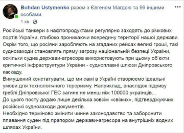 "Кроме того, что россияне зарабатывают на данных рейсах немалые деньги, такие судозаходы - это угрозу национальной безопасности Украины, так как суда государства-агрессора используют при этом объекты критической инфраструктуры Украины – судоходные шлюзы Днепровского каскада", – написал Устименко.