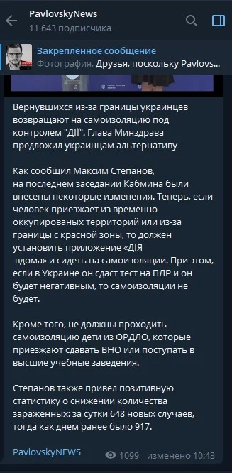 Как передает новостной телеграмм-канал PavlovskyNews, по словам министра здравоохранения, на последнем заседании представителей Кабинета министров были внесены некоторые изменения. Отмечается, что если теперь граждане прибывают из за границы с красной зоны, или же с неподконтрольных территорий, то они должны установить приложение «Дія», отправившись на самоизоляцию.