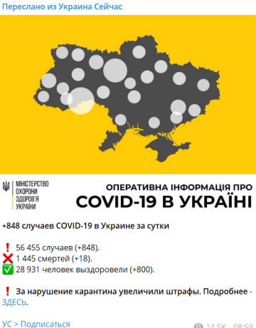 Согласно данным, обнародованным Министерством здравоохранения, по состоянию на утро 16 июля, в стране с начала эпидемии были инфицированы уже 56 455 граждан. При этом только за сутки 15 июля положительный результат тестирования на коронавирусную инфекцию получило еще 848 граждан.