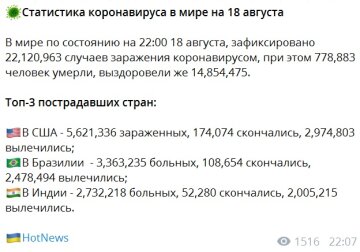 На 18 августа зафиксировано 22,120 миллиона случаев заболевания Covid-19. Уже около 778, 8 тысяч жителей нашей погибло, а выздоровело 14,8 миллиона.
