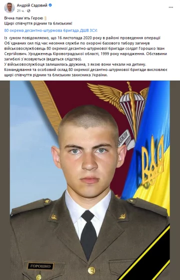 Погибший боец был родом из Кировоградской области, на момент смерти ему исполнился всего 21 год. Пока что все обстоятельства смерти молодого военнослужащего Вооруженных сил Украины выясняются в рамках расследования. Без супруга осталась молодая жена, которая сейчас ждет ребенка.