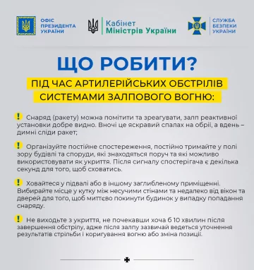 При артилерійських обстрілах з системи залпового вогню - його дуже добре видно, як вдень, так і вночі. Вночі він світиться яскраво, а вдень видно димовий слід. Як тільки побачили таке озброєння, потрібно ховатися в підвалі або в поглибленому приміщенні. Тримайтеся далі від вікон і ближче до виходу. Відразу після вибухів не виходьте з укриття, почекайте хвилин 10.
