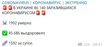 В то же время за весь период эпидемии коронавирусной инфекции в Украине было заражено 86 140 человека, из которых для 1992 пациентов болезнь прошла с осложнениями и закончилась летально. 45 686 граждан из всех заболевших при контрольном тестировании получили отрицательные результаты и были выписаны из медучреждений.