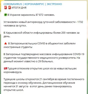 Как стало известно, в Украине заболели 87 872 человек. Установлен новый антирекорд суточной заболеваемости — 1732 больных за сутки.