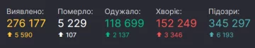 Всего с начала эпидемии в нашей стране подтверждено 276177 случаев инфицирования. В течение суток, 13 октября, в Украине зафиксировано 107 летальных исходов от коронавируса, всего пандемия унесла жизни 5229 украинцев.
