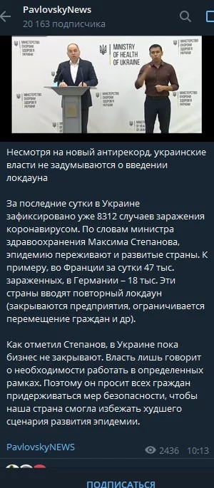 Как передает новостной телеграмм-канал PavlovskyNews, ситуацию прокомментировал министр здравоохранения Максим Степанов на своем брифинге. Стало известно, что за последние сутки в Украине зафиксировали 8 312 новых случаев заболевания. Стоит отметить, что на данный момент это антирекорд по статистике заболевания коронавирусом в стране.