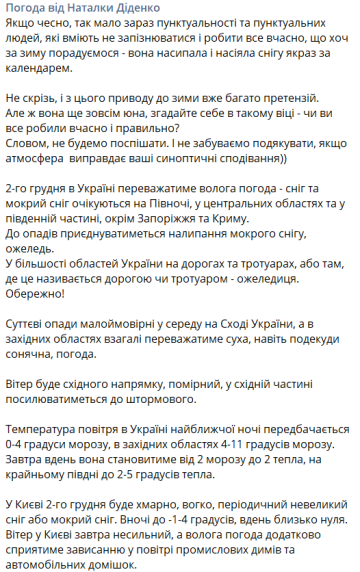 Для многих жителей Украины календарная зима в этом году наконец-то совпала с погодной, и хотя подобные совпадения в последнее время не так часто бывают в нашей стране, в первый день декабря теплые куртки и варежки точно не помешали. А насколько капризной окажется природа в последующие дни, наверняка знает синоптик Наталья Диденко, которая на своем телеграм-канале рассказала о погоде 2 декабря.