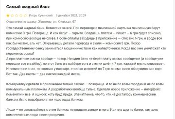 "Це самий жадібний банк. Комісія за все. При переведенні з пенсійної картки на пенсійну беруть комісію 3 грн. Позорище. І як беруть - приховано. Створюєш платіж-пише-6 грн буде списано, про Комісію взагалі не слова. Після оплати заходиш в додаток - списано 6 грн, і начебто все як би чесно, але ні. Відкриваєш деталі перекладу і вуаля - комісія 3 грн. Ганьба Державному банку займатися шахрайством", - написав чоловік.